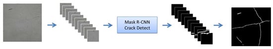 On the other hand, when calculating the mask for the crack regions in the images, the images were not resized in this study. Instead, the original images were segmented into several smaller images with a size of 448 × 448 pixels, which were then fed into the Mask R-CNN model. The segmentation results of these cropped images were subsequently stitched together to reconstruct the original image, as illustrated in Figure 3. This approach prevented the loss of subtle crack features due to resizing, ensuring the accurate identification of cracks.