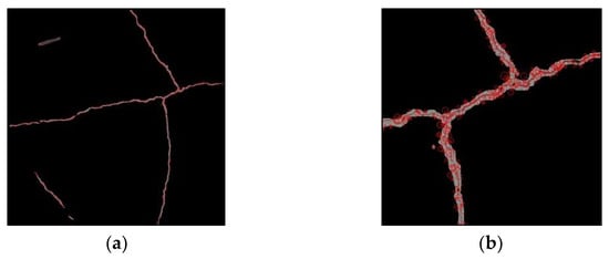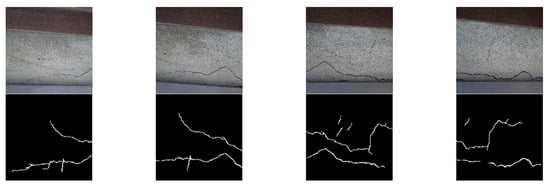 In addressing the limitations of the Canny algorithm for crack detection, recent developments in convolutional neural networks (CNNs) have proven effective [,]. Whether using object-detection models or image-segmentation models, CNNs demonstrate excellent performance in crack detection. Unlike object-detection models, image-segmentation models can perform pixel-level classification on images while effectively marking crack areas with masks and being robust to noise []. This facilitates the extraction of regions of interest (ROIs) for crack image stitching.
