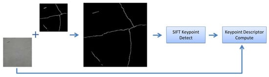 Due to the aforementioned limitations, this study proposes the partitioning of the mask into ROIs, followed by the detection of keypoints for matching in the ROI images. As long as there is an overlap in the ROIs between two adjacent images, matching and stitching can be accomplished based on the keypoints in the overlapping area. In the method proposed by this study, the pixels of the crack area will constitute the overlap between the two images, while other aspects, such as false positives from non-overlapping sections, will not affect the matching outcome. This approach not only mitigates the impact of mask shape differences but also significantly increases the number of keypoints within the ROIs, concentrating keypoints on crack pixels within the image (as shown in Figure 5). Moreover, the keypoints calculated using this method are more representative of the texture information of crack pixels. The computation of keypoints follows the feature-point-detection method used for the SIFT, which can be used to calculate keypoints at different scales.