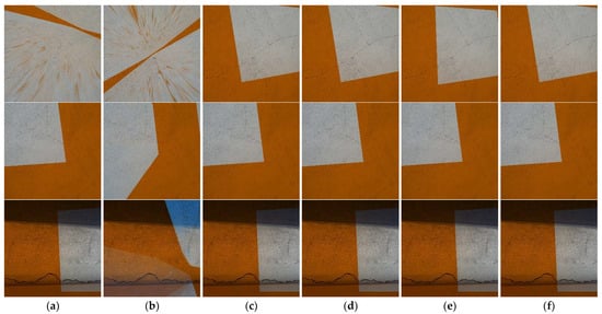 In these images, Figure 8a,b both exhibit obvious failures; additionally, while the matching result in Figure 8e appears to be successful, in comparison with Figure 8c,d,f, the first image still shows slight differences in the upper-right corner of the image. From the matching results of these three sets of images, it can be observed that the method proposed in this study is capable of performing matching effectively, regardless of the type of matcher used. Compared with the method of matching using only ROI images, the proposed method effectively enhances the matching robustness.