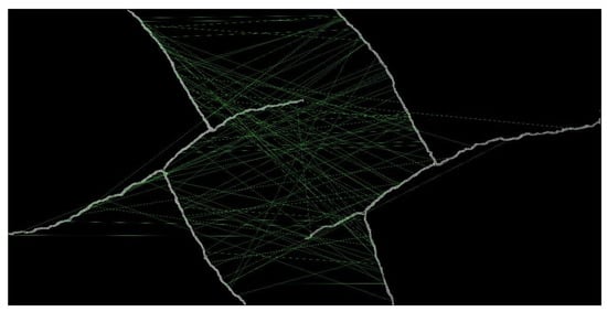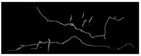 Before continuous stitching, perspective projection correction was performed on the images at the branching points using feature-point spatial coordinates measured on-site. This not only ensured that the projection posture of the images was parallel to the wall surface but also provided information on the image scale. Subsequently, during stitching, the images at the branching points were fixed, and adjacent images were sequentially inserted into them. Finally, the complete image of Crack 1 was assembled from the images at the branching points, as shown in Figure 12. In Figure 12, the upper-left branch of the crack corresponds to Crack 1–3, the lower-left branch corresponds to Crack 1–1, and the right branch corresponds to Crack 1–2. Throughout the entire process of continuous stitching of the crack images, only image grouping and perspective projection correction required manual processing, while the other steps were automatically handled by the program without the need to adjust any parameters.