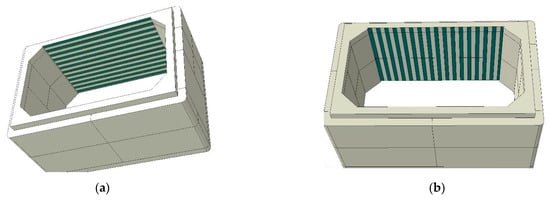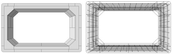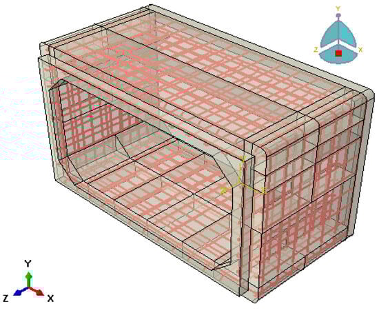 The numerical model was developed based on the experimental research of Maximos et al. []. The chosen geometry and reinforcement detailing of the FEM model incorporated reinforcement according to the American Society of Testing and Materials (ASTM) C1577 [] standard for culverts. Figure 2 depicts the geometry of the box culvert along with the steel reinforcement cage modeled in Abaqus. The specimen’s dimensions were 1220 × 2120 × 203 mm, where the long-span length and inner short lengths of the culverts were represented by the first two dimensions, and the slab and wall thickness by the third. The reinforcement cage was composed of bars spaced 180 mm apart with a diameter of 10 mm.