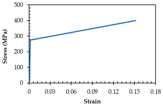 An elastoplastic constitutive model was utilized for the simulation of steel due to its behavior, which is characterized by both the elastic and plastic regions described by Young’s modulus and post-yield Young’s modulus. Figure 4 provides a pictorial representation of the steel’s typical stress and strain behavior. The bilinear behavior indicates the plastic phase characteristics, which exhibit the typical reinforcement relationship between the stress and strain integrated into the model [,].