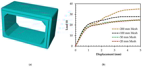Figure 7b presents the analysis results, and Table 6 compares the ultimate load and deflection responses for structures having different mesh sizes. Upon examination of Table 6 and Figure 7a, it was found that setting the mesh size to 50 mm reduced the amount of errors in the results. Additionally, results with small changes were consistently obtained when the mesh size was smaller than 50 mm. Although the outputs were not found to be significantly impacted by the mesh size owing to the small element size, a slightly larger element size was chosen to decrease the computational time.