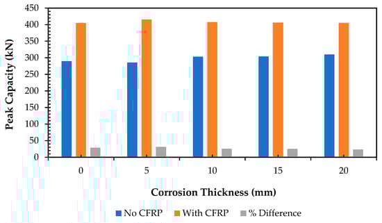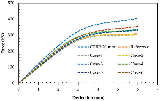 CFRP sheets were used to mitigate the issue of corrosion in box culverts. Figure 9 depicts a comparative analysis of the capacities between the reference model and models incorporating CFRP sheets to mitigate damage caused by corrosion. The reference models, denoted as Reference_0, Reference_5, Reference_10, Reference_15, and Reference_20, respectively, represent varying degrees of damage thicknesses in the slab, ranging from 0 mm to 20 mm. In contrast, the CFRP models, labeled CFRP_0, CFRP_5, CFRP_10, CFRP_15, and CFRP_20, maintain the same damage thickness as the reference models but incorporate CFRP sheets to counteract the effects of corrosion.