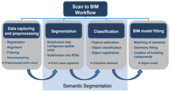 - Gourguechon, C.; Macher, H.; Landes, T. Automation of As-Built Bim Creation from Point Cloud: An Overview of Research Works Focused on Indoor Environment. Int. Arch. Photogramm. Remote Sens. Spat. Inf. Sci. 2022, XLIII-B2-2022, 193–200. [Google Scholar] [CrossRef]
