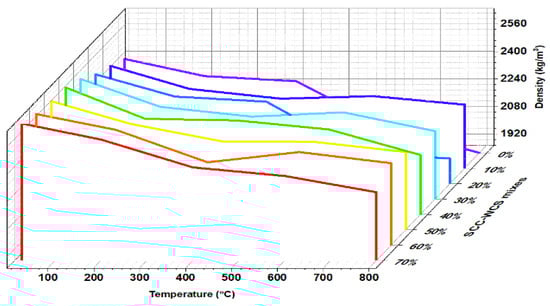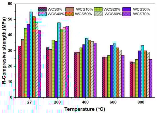 Figure 10 depicts the residual density (R-D) of SCC-WCS% mixes at ambient and elevated temperatures of 27 °C, 200 °C, 400 °C, 600 °C, and 800 °C. The residual density of mixes exhibits an incremental trend with WCS content at elevated temperatures. Figure 10 shows the R-D, at 27 °C ranging from 2400 to 2650 kg/m3, at 200 °C ranging from 2302 to 2555 kg/m3, at 400 °C ranging from 2272 to 2396 kg/m3, at 600 °C ranging from 2000 to 2345 kg/m3, and at 800 °C ranging from 1855 to 2250 kg/m3. The density of the SCC-WCS% mixes at 27 °C shows an increment of about 2.8% to 10.41% at 200 °C, 400 °C, 600 °C, and 800 °C. The slight decrement in R-D ranges from 3.5 to 6.9%, 5.3 to 11.9%, 7.78 to 20%, and 10 to 29.3% compared with ambient temperature for SCC-WCS mixes. Figure 10, exhibits an incremental trend in density compared with the control mixture (SCC-WCS0%) at elevated temperatures of 27 °C, 200 °C, 400 °C, 600 °C, and 800 °C. However, the decrement for WCS at 10% and 60% is 0.52% and 5.35% for 400 °C, while the decrement for WCS at 20%, 40%, and 70% is 10.26%, 0.42%, 2.08%, and 10.1%, 2.22%, and 3.43% for 600 °C and 800 °C, respectively.