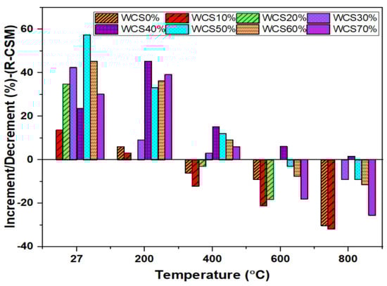 Figure 5, represents the R-CMS of SCC-WCS% mixes at elevated temperatures. The CMS results at 27 °C are 33, 37.5, 44.5, 47, 55, 52, 48, and 43 MPa, while the R-CMS results at 200 °C are 35, 36, 42, 43, 47, 44, 45, and 44 MPa, respectively; at 400 °C, the R-CMS results are 31, 29, 32, 34, 38, 37, 36, and 35 MPa; at 600 °C, the R-CMS results are 30, 26, 27, 33, 35, 32, 30.5, and 27 MPa; and at 800 °C, the R-CMS results are 23, 22.5, 24.5, 30, 33.5, 30, 29.2, and 24.5 MPa at 0%,10%, 20%, 30%, 40%, 50%, 60%, and 70% WCS substitution with sand in SCC mixes. Due to the effect of elevated temperature, a slight decrement in strength is recorded, ranging from 6% to 30.9% at 400 °C, 9% to 39.3% at 600 °C, and 30% to 44.9% for 800 °C compared with the R-CMS of SCC-WCS0% at the relevant temperature mix. This is due to water escaping from the matrix and creating cavities, leading to a drop in CMS, and by breaking the ITZ, resulting in micro–macro expansions in SCC-WCS% mixtures [15]. When compared with the R-CMS of WCS0%,the variation in R-CMS of SCC-WCS% mixes ranges as follows: 2.85% to 22.5% at 200 °C, 3.22% to 19.35% at 400 °C, 6.6% to 29.2% at 600 °C, and 6.52% to 36.73% at 800 °C. Figure 6 depicts the changes in R-CSM compared with SCC-WCS0% at respective temperatures. At elevated temperatures, all mixes show an incremental trend in R-CSM up to 400 °C. The R-CMS is increased from 3% to 45.45% at 200 °C and 3.03% to 15.15% at 400 °C. But the WCS10% and WCS20% mixes exhibit a decrement of 6%, 12.12%, and 3% at 400 °C. After that, there is a moderate decrement of about 3% to 21% at 600 °C and 9% to 60% at 800 °C. The R-CMS of the SCC-WCS% mixes ranges from 31 to 34 MPa at 400 °C, 26 to 35 MPa at 600 °C, and 22.5 MPa to 33.5 MPa at 800 °C, as shown in Figure 6.