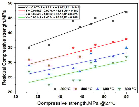 All SCC-WCS% shows an improvement in the performance of R-CMS when subjected to elevated temperatures compared with the control mix at the respective temperature. The results of SCC-WCS% with 40% to 60%WCS mixes show a maximum R-CMS than with the control mix at the respective temperatures. The hydration process of the SCC matrix results in a continuous homogeneous and denser C-S-H gel at ambient and elevated temperatures ranging from 200 to 800 °C, leading to an increment in CMS of up to 50%. In AAS, mortar made with 20% copper slag exhibits an optimum performance at elevated temperatures up to 800 °C, leading to an increment in CMS of up to 50%. Based on the elevated temperatures, the regression analysis is performed on SCC-WCS% mixes as shown in Figure 7. It represents the correlation of the R-CMS of SCC-WCS% mixes at the elevated temperatures. The correlation coefficients are obtained from R-CMS to CMS at 200 °C, 400 °C, 600 °C, and 800 °C for SCC-WCS% mixes as follows: R2 is 0.944, 0.889, 0.725, and 0.706.For all the mixes, the deviation of error is 6% at 200 °C, 11% at 400 °C, 17% at 600 °C, and 30% at 800 °C with the SCC mixes.