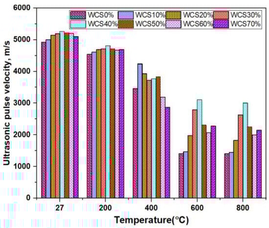 Figure 8 shows the UPV values of the SCC-WCS mix subjected to elevated temperatures of 27 °C, 200 °C, 400 °C, 600 °C, and 800 °C. The following are the UPV results of SCC-WCS% mixes at ambient and elevated temperatures: At ambient temperature, the UPV results are 4925, 5000, 5150, 5200, 5267, 5220, and 5108 m/s. At 200 °C, the UPV results are 4545 m/s for WCS0%,and the WCS10% to 70% results are 4608, 4695, 4717, 4673, and 4695 m/s, respectively. At 400 °C, UPV results at WCS0% are 3460 m/s, and at WCS10% to 70% results are 4237, 3931, 3723, 3771, 3831, 3190, and 2870 m/s, respectively. At 600 °C, UPV results at WCS0% are 1408 m/s, while WCS10% to 70% UPV results are 1468, 1976, 2786, 3108, 2309, 2066, and 2278 m/s. At 800 °C, UPV results at WCS0% are 1400 m/s, while the WCS10% to 70% results are 1450, 1825, 2635, 3005, 2255, 1995, and 2150 m/s respectively. The results showed the UPV values were a slight drop from 27 °C to 200 °C. The decrement is very low, below 3%. At 400 °C, WCS60% shows a 7.8% decrement and WCS70% shows a 17% decrement. In all elevated temperatures, sand substitution with WCS in SCC mixes exhibits a good quality of concrete compared to SCC-WCS0% (CC) as per the recommended code listed in Table 3.