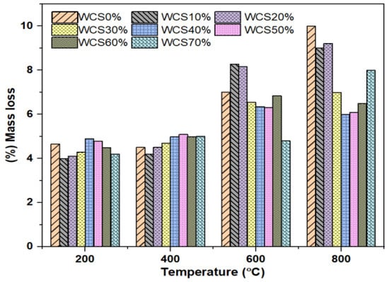 Figure 9, shows the mass loss at different high temperatures for SCC-WCS% mixtures. The mass loss results in SCC-WCS% mixtures at 200 °C are 4.65% for WCS0% and the WCS10% to 70% mass loss results are 4%, 4.1%, 4.3%, 4.9%, 4.8%, 4.5% and 4.2%. At 400 °C, it is 4.5% for WCS0%, and the WCS10% to 70% mass loss results are 4.2%, 4.5%, 4.7%, 5%, 5.1%, 5%, and 5%. At 600 °C, the WCS0% is 7%, and the WCS10% to 70% mass loss results are 8.2%, 8.16%, 6.56%, 6.36%, 6.32%, 6.85%, and 4.8% mass loss. At 800 °C, the WCS0% is 10% and the WCS10% to 70% mass loss results in 9%, 9.21%, 7%, 6%, 6.1%, 6.5%, and 8%, respectively.