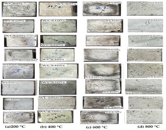 Figure 11 shows pictures of the surface of SCC-WCS% mixtures treated at elevated temperatures ranging from 200 to 800 °C. The SCC-WCS% mixes show no significant crack up to 600 °C, but the increase in temperature causes void spots on the surface. Figure 11c shows a crack in the WCS0% mix at 400 °C. In Figure 11d, at a higher temperature of 800 °C cracks are observed in SCC-WCS% mixes. It is chemical decomposition that leads to crack creation [16]. All the samples show color alterations between 400 °Cand 800 °C. The samples exhibit a dark gray colour at temperature of 400 °C and become lighter when the temperature increases to 800 °C [18].