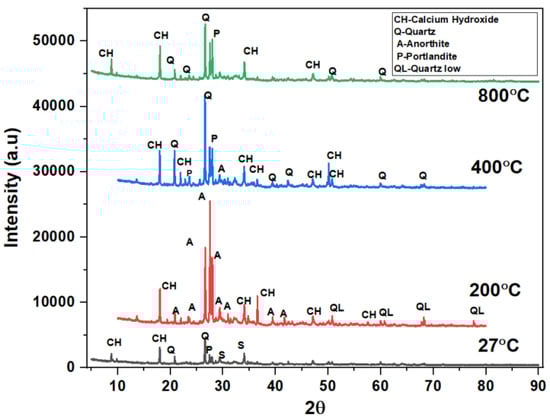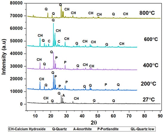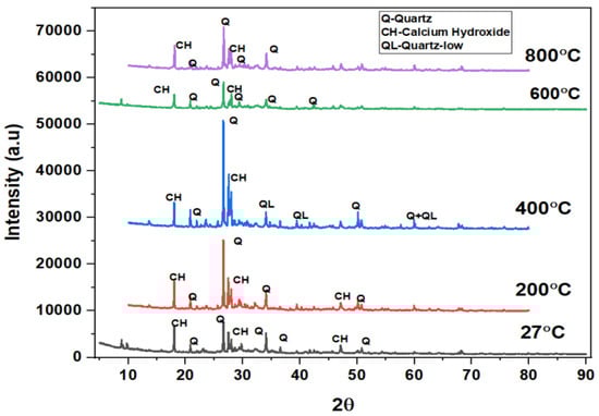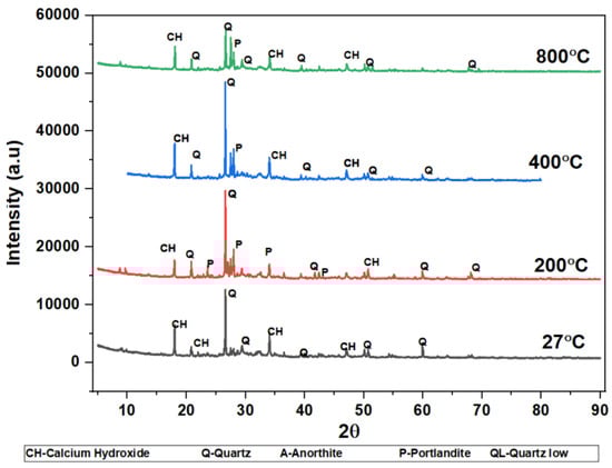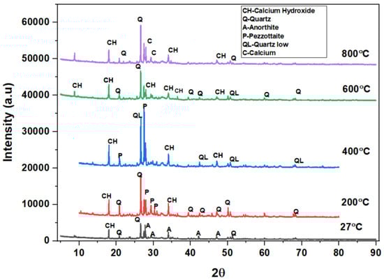 The phases of the concrete matrix were measured with X-ray diffraction (XRD). XRD phases are presented for SCC mixes at sand replacement with WCS from 0% to 70%. Powder samples were taken from the SCC-WCS mixes after CSM at 28 days of curing. XRD was performed at 2θ, ranging from 5 to 90 degrees. The XRD patterns for SCC-WCS% mixes at elevated temperatures ranging from 27 °C to 200 °C, 400 °C, 600 °C, and 800 °C are shown in Figure 12, Figure 13, Figure 14, Figure 15, Figure 16 and Figure 17. The SCC-WCS% mixes contained multi-phase peaks. The main peak phases of the SCC mix at 0% WCS at elevated temperatures are as follows: at 27 °C, 200 °C, 400 °C, 600 °C, and 800 °C, the peak phases are quartz and calcium hydroxide, as shown in Figure 12. The main peak phases of the SCC mix at 20% and 30% WCS at elevated temperatures are as follows: at 27 °C, 200 °C, 400 °C, 600 °C, and 800 °C, the peak phases are quartz, anorthite, portlandite, and calcium hydroxide, as shown in Figure 13 and Figure 14.