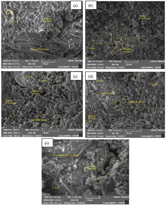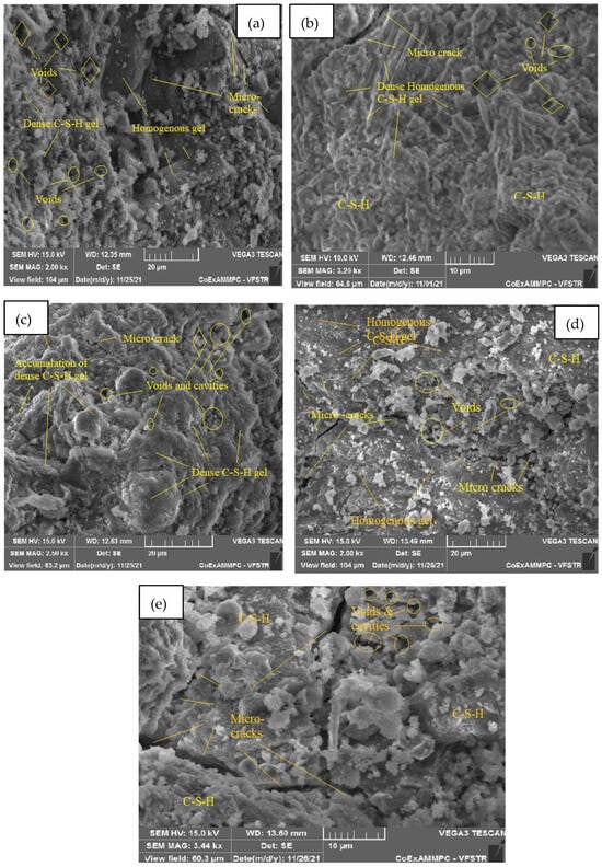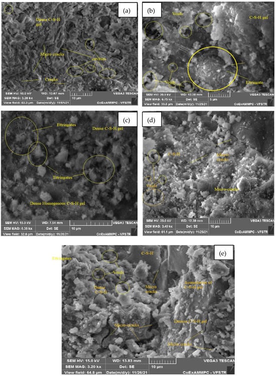 Figure 21a–e represent an SEM image of WCS40% in SCC mixes after 28 days of curing at room and elevated temperatures. Figure 21a, at room temperature, shows hydration is uniform throughout the matrix. It exhibits homogenous C-S-H gel and calcium hydroxide (CH) with few voids. Figure 21b, at 200 °C, shows uniform morphology with a dense C-S-H gel and few voids and cracks. At 400 °C, water escapes from the matrix, leading to voids and cracks due to the high temperature. The formation of ettringite with a dense C-S-H gel due to hydration is shown in Figure 21c. Figure 21d depicts the formation of a homogeneous C-S-H gel, ettringite, and voids and cavities at 600 °C. Figure 21e shows a dense C-S-H gel structure with a network of microcracks and voids at 800 °C.