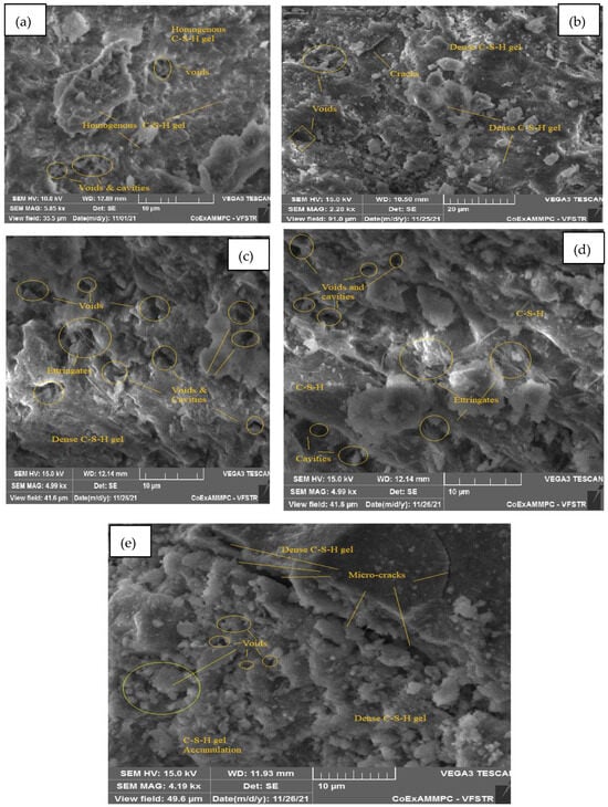 Figure 20a–e represent an SEM image of WCS30% in SCC mixes after 28 days of curing at room and elevated temperatures. Figure 20a, at 27 °C, presents an enriched microstructure with a denser C-S-H gel, and certain micro cracks and cavities are also observed. In Figure 20b, at 200 °C, the morphology of the SEM image shows a dense C-S-H gel; ettringite formation leads to a good strength in the matrix but a small number of voids. The high temperature of 400 °C improves the hydration process of the matrix observed in dense homogeneous C-S-H gel and ettringite, as shown in Figure 20c. Figure 20d shows that at 600 °C, the observed voids, cracks, and cavities were caused by water escape rather than by a homogeneous C-S-H gel. Figure 20e, at 800 °C, shows the denser accumulation of the C-S-H gel with certain microcracks and voids.