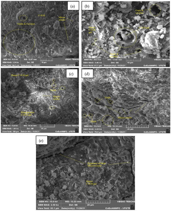 The microstructure is studied from SEM images at ambient temperature and elevated temperatures of 200, 400, 600, and 800 °C, respectively, after 28 days of curing for SCC mixes with sand replacement with WCS from 0% to 70%, shown in Figure 18, Figure 19, Figure 20, Figure 21, Figure 22 and Figure 23. Figure 18a–e represent an SEM image of WCS0% in SCC mixes after 28 days of curing at room and elevated temperatures. Figure 18a depicts an SEM image of C-S-H gel at 27 °C with small cracks and voids. Figure 18b represents a 200 °C SEM image that shows voids and gaps which are observed in the microstructure, and needle-like structures observed with a dense C-S-H gel. At 400 °C, Figure 18c depicts needle-like ettringite structures and air voids in the concrete matrix. Figure 18d depicts voids and cavities at 600 °C. Due to the elevated temperature expulsion of water in the concrete matrix, serious air gaps are observed, leading to a change in the chemical bond of the interfacial transition zone (ITZ), but some parts show denser C-S-H gel formation [39,40,41,42,43,44,45,46]. As seen in Figure 18e, at 800 °C, due to elevated temperatures, more water escapes from the matrix, leading to a large number of voids and cracks appearing in the microstructure. Figure 19a–e shows an SEM image of WCS at 20% in SCC mixes after 28 days of curing at room temperature and higher temperatures.