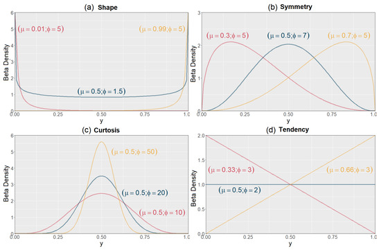 Ref. [10] developed a model suitable for situations in which the behavior of the response variable can be modeled as a function of a set of explanatory variables, as in a traditional regression, taking into account the response variable following the beta distribution, which restricts the analysis to the continuous interval (0, 1) and which has great flexibility for modeling.
