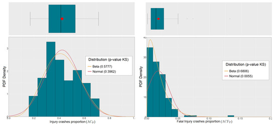 When the interest lies in modeling the traffic injury crash proportions, a barrier to using a regression model for discrete data is that the value is continuous and restricted to the interval [0, 1]. It is also not appropriate to use classical linear regression, even if the data are continuous, because the data may exhibit right-skewness since the proportion of traffic injury crashes is generally low relative to the number of crashes. For situations like this [10], the beta regression model is considered, which assumes that the response variable follows a beta distribution. This distribution is supported by the continuous unit interval (0, 1) and offers the flexibility to model both symmetric and skewed data.
