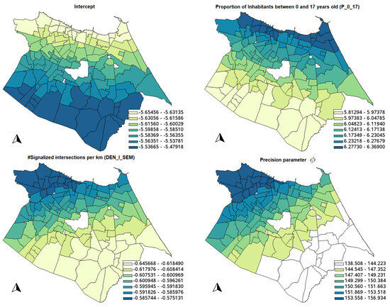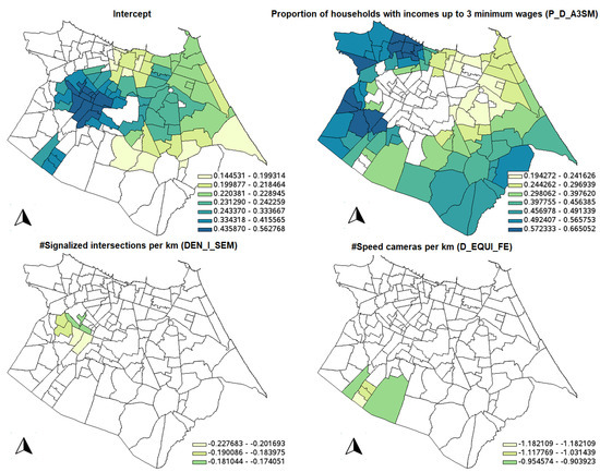 Table 7 shows the descriptive statistics for the GWBR model. In the same fashion as the GWR model, Figure 5 shows the significant parameter estimates for the GWBR model; it is possible to see that all counterintuitive signs of the variables are not significant, considering the 10% significance level. Also, note that variables DEN_I_SEM and D_EQUI_FE are not significant in any location, but the spatial distributions of the other variables are smoother than in the GWR model. This is because GWR requires a smaller bandwidth to fit the data a little bit better compared to GWBR (compare the ENPs: 42.97 in GWR against only 8.96 in GWBR), generating an overfitted model (the same pattern is observed by [11] when GWPR is compared to GWNBR). With the spatial distribution of the GWBR coefficients, it is easier to understand the crash dynamics in the city.