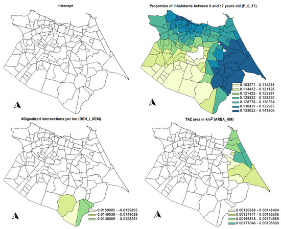 Table 11 shows the descriptive statistics for the GWBR model and Figure 8 shows the significant parameter estimates for the GWBR model. It is possible to see that all counterintuitive signs of the variables were not significant, considering the 10% significance level; moreover, the variable AREA_KM was not significant in any location (not shown in the figure). Again, the same smoother distribution of the parameter estimates is observed in the GWBR model.