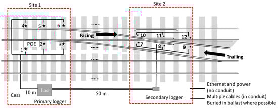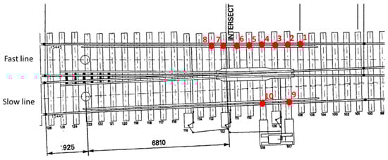 A set of points on a high-speed line in the UK were instrumented around the switch (and crossing—see Section 3) with bearer-mounted geophones and accelerometers, and rail-mounted strain gauges []. Figure 1 shows the locations of vertically sensing, bearer-mounted accelerometers (marked with stars) from which the data used in this section (and the next) were collected. The bearer-mounted accelerometers were two types of MEMS sensor, a voltage-output and a current-output type. The voltage-output type has a range of about ±350 ms−2 and the current-output type has a range of about ±200 ms−2. These sensors work down to DC without phase shift or gain variations and cost a few hundred GBP each. They contain MEMS accelerometer integrated circuits internally with an analogue output of voltage or current created. The details of the MEMS sensing element inside each sensor are unknown, but a sensor could be made with a GBP 5 part or a GBP 100 part without significantly changing the cost of the unit as a whole. However, the difference in terms of displacement from acceleration when used on a railway bearer will likely be considerable.
