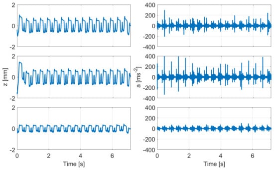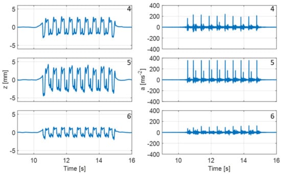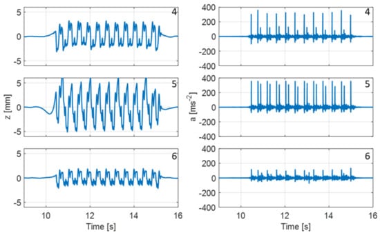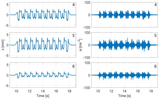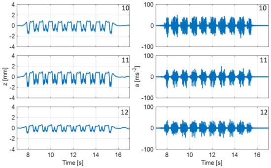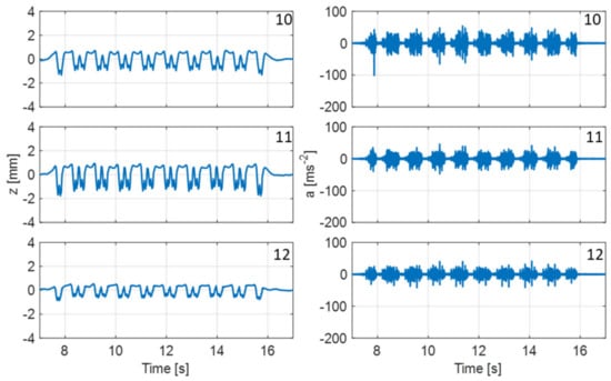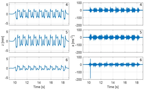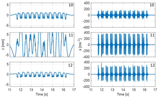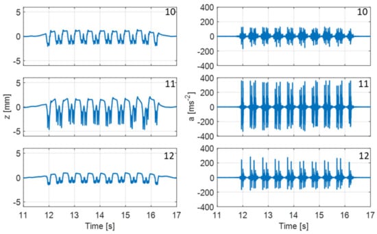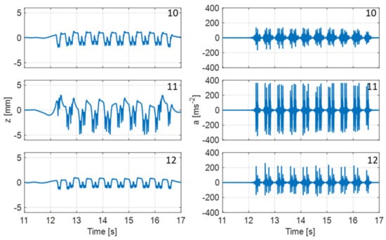 The displacements are similar to those found in Figure 13, but much higher accelerations are observed corresponding to some wheelsets, especially at sensor location 5 (top row), where the acceleration just exceeds 100 ms−2, which is much more than that seen for the previous train with the same speed. It still remains well within the accelerometer range. This case has been labelled a “faulty train” on the grounds that other trains with a similar speed did not show this behaviour. However, it is also possible that the swing-nose crossing did not close fully, or some other cause independent of the train could be responsible for the increased accelerations.