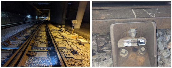 Milne and colleagues [] deployed MEMS accelerometers on over one hundred consecutive sleepers in one night and then moved the sensors overnight to extend the covered section, to investigate track stiffness via the harmonic content of the carriage passing frequency []. The peak-to-peak displacement (or the peak downwards motion from an estimated initial zero level) was also recorded. The accelerometers were ADXL345 devices (Analog Devices, Wilmington, MA, USA), sampling at up to 3200 Hz with a ±16 g range and the train speed was 55 to 65 ms−1 []. The use of accelerometers on transition zones is less well developed because the support stiffness is highly likely to vary significantly from one bearer to the next and there are other considerations, such as the existence of wheel impacts at crossings and possibly at switches. There is considerable work ongoing in this area, including reconstruction of vertical bearer displacements on switch and crossing panels in [].
