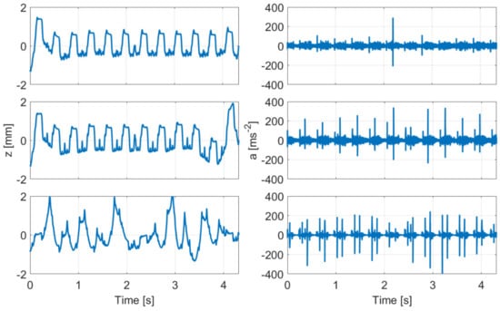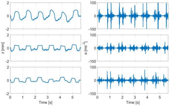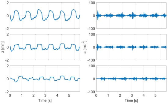 A simple place to start for automated processing of accelerometer data from railway sleepers is described in []. Double integration by Euler or trapezoidal integration followed by zero phase shift high-pass filtering is used to remove “drift”, ideally at one-half to one-third of the carriage passing frequency (the train speed divided by the carriage length). Low-pass filtering may be added to show displacement only up to 20 Hz (the 10th harmonic of the carriage passing frequency []), although after double integration this should not make much practical difference. An important branch of this work is looking for track stiffness without knowing the train loading [,]. Another paper on integration of acceleration for railway applications is [], which also shows spectra of the accelerations and explains the meaning of the spectral peaks.