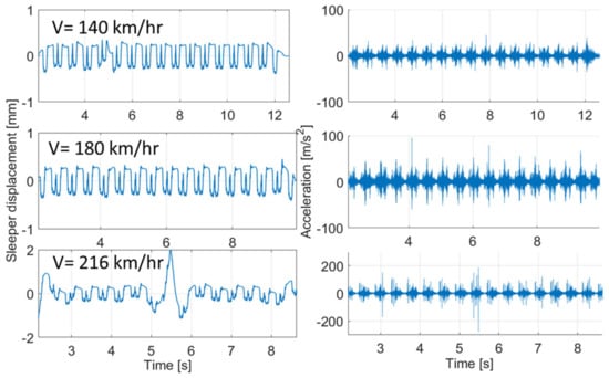 Displacement and acceleration result from sensor 9, where strange inverted displacement is found only at certain train speeds. In this subsection, the data (of which there is a large quantity for site 3) are examined more closely. Figure 17 shows the results at sensor 9 from a class 374 train with three different speeds.