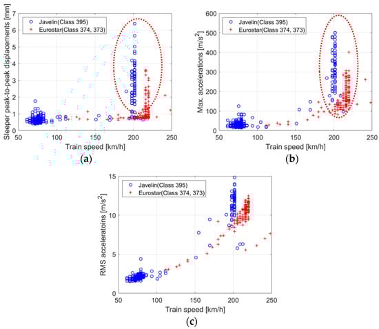 Figure 19 shows the peak-to-peak displacements, maximum accelerations, and RMS acceleration, at sensor 9 against different speeds for class 395 and 374 trains.