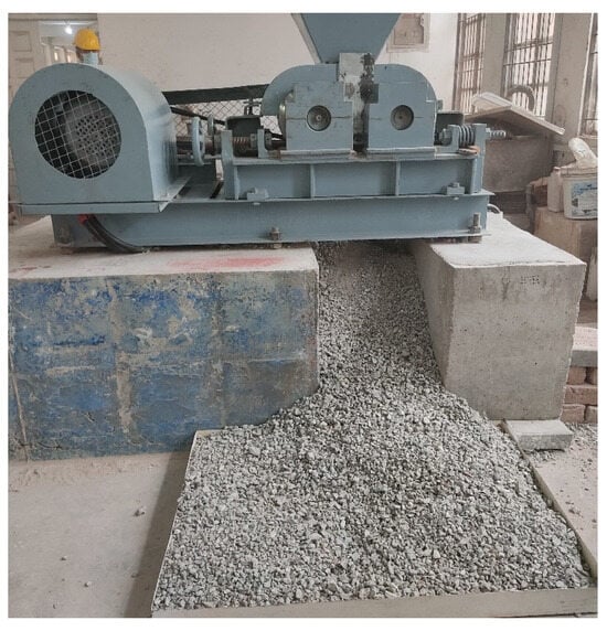 To prepare CRAC mixes, fly ash (FA) was procured from the Sahiwal Coal Power Plant built under the China Pakistan Economic Corridor (CPEC). FA was used as a 100% replacement for cement in the CRAC mix (Figure 1a). The fine aggregates (Lawrencepur sand) were sourced from Punjab, Pakistan (Figure 1b). The NCA were sourced from Margalla Hills, Punjab, Pakistan (Figure 1c). The RCA was prepared by crushing waste concrete with concrete compressive strengths between 21 MPa and 28 MPa using the concrete crusher in the Plain and Reinforced Concrete (PRC) Lab, Civil Engineering Department (CED), University of Engineering and Technology (UET), Lahore (Figure 1d) (Figure 2). The alkaline activator solution comprised sodium hydroxide (NaOH) solution and sodium silicates (Na2SiO3) solution obtained from the local vendor (Figure 3).
