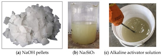The NaOH solids and Na2SiO3 solution were procured from a local vendor in Pakistan. The 14 M NaOH solution was prepared by dissolving 42.75% NaOH pellets (540 g solids) in 1000 mL water (Figure 3). The 14 M NaOH solution was prepared 24 h prior to the casting. The Na2SiO3 solution and NaOH solution were mixed in a ratio of 1.5 to 1.