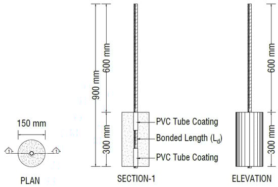 The bond stress is assumed to be uniformly distributed along the embedment length of the steel bar. The interaction between the concrete and the embedded steel has a significant influence on the overall structural performance. The bond stress, , at the interface between the concrete and the steel bar was calculated using Equation (1).
