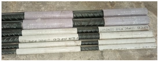 At first, the top and bottom parts of the steel bar to be embedded in concrete were enveloped in PVC tubes. The middle part of the embedded steel was left unenveloped, which was to be bonded with concrete (Figure 5). Afterwards, the steel bar was concentrically placed in the pull-out cylindrical mold and the steel bar was embedded within the cylindrical mold for a required embedment length (4 and 6) (Figure 6). The top and bottom joints of the embedded length were sealed with silicone gel. To keep the steel bar truly vertical, a steel cap and a wooden plate with a hole equal to the bar diameter were placed at the top and bottom ends, respectively (Figure 7).