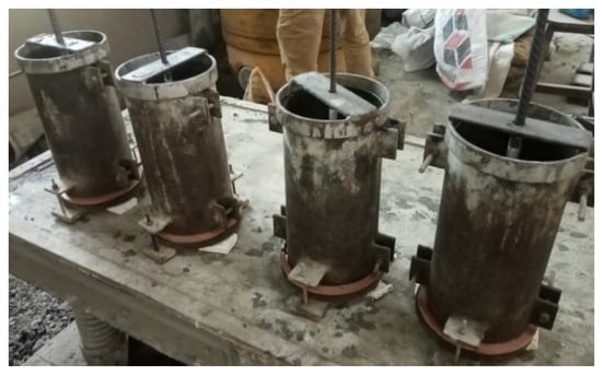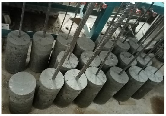 The slump of the CRAC mix was determined using the slump cone apparatus according to ASTM C143-20 []. The pull-out and cylindrical test molds were filled in three layers, and each layer was vibrated using the mechanical vibrating table for about 30 s. The specimens were demolded after 24 h of casting and were cured at room temperature for 28 days (Figure 7).