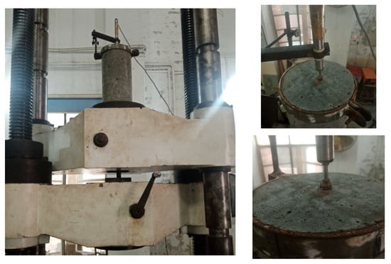The pull-out specimens were tested in a 1000 kN Shimadzu Universal Testing Machine (UTM) under the displacement-controlled load application of 2 mm/min according to ASTM C900-19 []. For each mix, two cylinders were tested at 28 days and the average compressive strength was measured []. The pull-out test setup is shown in Figure 8.