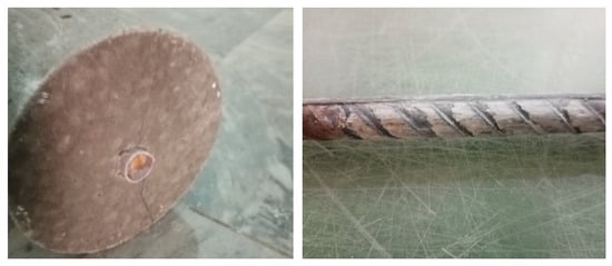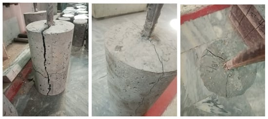 In most of the specimens, failure occurred due to bond failure between the embedded steel bar and the surrounding concrete. This type of failure occurred when the bond stress between the concrete and the steel was lower than the tensile strength of the steel. The bond failure indicated that the interface between steel reinforcement and the concrete matrix could not withstand the applied tensile forces, which resulted in the separation of the reinforcement from the surrounding concrete. The bond failure was observed in 9.5 mm and 12.7 mm diameter embedded steel bars. The observed failure patterns in the case of the yielding of the steel bar and bond failure were similar (Figure 9).