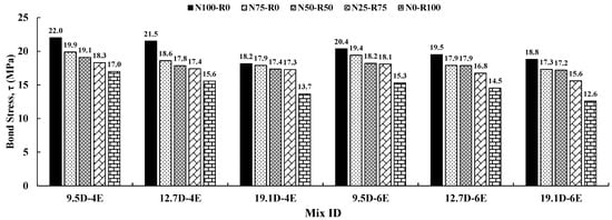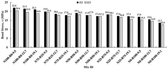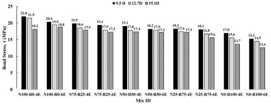 Figure 11 presents the influence of varying embedment lengths of steel bar (4 and 6) in CRAC pull-out specimens. It was observed that the bond stress decreased with increasing embedment length for all diameters of embedded steel bar and percentage replacements of NCA with RCA in CRAC. For mixes prepared with 100% NCA and 0% RCA (N100-R0), the bond stress was decreased by 7.27%, 9.30%, and 10.90%, respectively, for 9.5 mm, 12.7 mm, and 19.1 mm diameter steel bars. Moreover, for mixes prepared with 75% NCA and 25% RCA (N75-R25), the bond stress was decreased by 2.51%, 3.76%, and 3.35%, respectively, for 9.5 mm, 12.7 mm, and 19.1 mm diameter steel bars. Furthermore, for mixes prepared with 50% NCA and 50% RCA (N50-R50), the bond stress was decreased by 4.71%, 0%, and 1.15%, respectively, for 9.5 mm, 12.7 mm, and 19.1 mm diameter steel bars. Similarly, for mixes prepared with 25% NCA and 75% RCA (N25-R75), the bond stress was decreased by 1.09%, 3.45%, and 9.83%, respectively, for 9.5 mm, 12.7 mm, and 19.1 mm diameter steel bars. For mixes prepared with 0% NCA and 100% RCA, the bond stress was decreased by 10%, 7.05%, and 8.03%, respectively, for 9.5 mm, 12.7 mm, and 19.1 mm diameter steel bars.