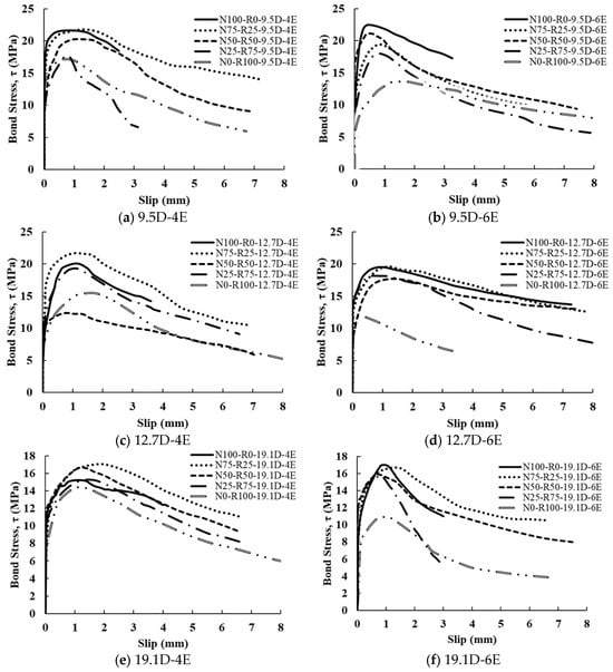 Figure 13 presents the influence of percentage replacements of NCA with RCA (0%, 25%, 50%, 75%, and 100%) on the bond stress of CRAC pull-out test specimens. The bond stress was decreased with increasing percentage replacements of NCA with RCA for all diameters of embedded steel bars and embedment lengths. For pull-out specimens with a 9.5 mm diameter steel bar and an embedment length of 4, the bond stress was decreased by 9.54%, 4.02%, 4.19%, and 7.1%, respectively, for percentage replacements of NCA with RCA of 25% (N100-R0 to N75-R25), 50% (N75-R25 to N50-R50), 75% (N50-R50 to N25-R75), and 100% (N25-R75 to N0-R100). Moreover, for pull-out specimens with a 12.7 mm diameter steel bar and an embedment length of 4, the bond stress was decreased by 13.49%, 4.30%, 2.25%, and 10.34%, respectively, for percentage replacements of NCA with RCA of 25% (N100-R0 to N75-R25), 50% (N75-R25 to N50-R50), 75% (N50-R50 to N25-R75), and 100% (N25-R75 to N0-R100). Furthermore, for pull-out specimens with a 19.1 mm diameter steel bar and an embedded length of 4, the bond stress was decreased by 1.65%, 2.79%, 0.57%, and 20.89%, respectively, for percentage replacements of NCA with RCA of 25% (N100-R0 to N75-R25), 50% (N75-R25 to N50-R50), 75% (N50-R50 to N25-R75), and 100% (N25-R75 to N0-R100).