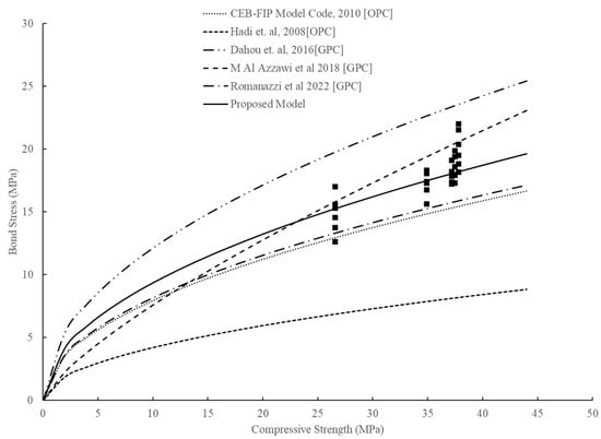 Analytical predictions of bond stress with varying compressive strength using existing models and the proposed model [,,,,].