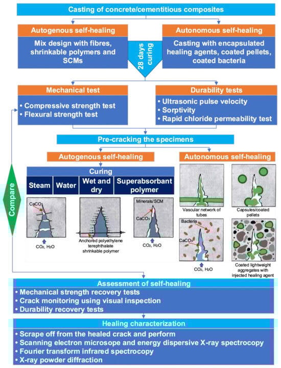 The high annual cost of maintenance and the growing concern about the safety and sustainability of infrastructure in Europe have increased interest in the development of self-healing cementitious materials and preventative repair methods. The appearance of small cracks (less than 300 microns in size) in concrete is inevitable, but does not necessarily cause the collapse of structures. However, small cracks weaken the functionality, accelerate degradation, and reduce the service life and sustainability of such structures. The enormous development that concrete technology has undergone in recent decades has led to the development of materials with extremely low porosity, but has not prevented the intrinsic risk of cracking. On the contrary, high-performance concretes are even more fragile and sensitive to cracking in a short time, compared to concretes that have a lower compressive strength. This behavior has given rise to the study of methodologies that can heal these fissures, which can be divided into passive methods, applied manually after an inspection and allowing only superficial cracks to be sealed, and active methods, incorporated into fresh concrete and therefore allowing both internal cracks and surface cracks to be healed. The latter techniques are also called self-healing techniques (Figure 3).