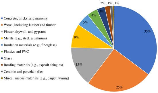 Depending on the source and separation methods, CDW primarily comprises inert mineral materials with varying amounts of other components. However, definitions and compositions of CDW can vary from state to state. It can be broadly classified into five categories: metal, concrete and mineral, wood, miscellaneous, and unsorted mixed fractions []. More specifically, these waste materials may include concrete, bricks, tiles, ceramics, wood, glass, plastic, bituminous mixtures and tars, ferrous and non-ferrous metals, soils, stones, insulation materials, gypsum-based materials (such as plasterboards), chemicals, waste electronic and electrical equipment (WEEE), packaging materials, and hazardous substances. Hazardous substances commonly found in building materials include asbestos, lead-based paints, phenols, polychlorinated biphenyls (PCBs), and polycyclic aromatic hydrocarbons (PAHs). Many substances, such as insulation, roofs, tiles, and fire-resistant sealing, are often used in conjunction with concrete to complete the structure and finishes. The composition of CDW varies significantly depending on factors such as local typology, construction techniques, climate conditions, economic activities, and technological advancements in the area []. Additionally, the composition of CDW changes over time due to aging buildings and low-quality structures built between the 1960s and 70s, which are now reaching the end of their lifespan and require demolishing []. Therefore, defining a standard composition representative of a large region is one of the biggest challenges to face. Figure 4 depicts the average composition of CDW.
