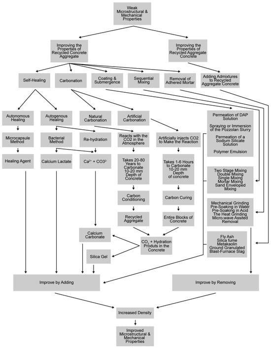 The existing literature indicates that there are six major methods available to enhance the properties of recycled aggregates. These methods can be categorized into two groups: the “improve by removing” category, whereby weaker parts of the recycled aggregate, for instance cracked cement zones, are removed by chemical and thermal processes; and the “improve by adding” category, where the aggregate is reinforced by the addition of mineral admixtures, or by self-healing, carbonation, sequential mixing, or fortification by coating and infiltration processes [,,].