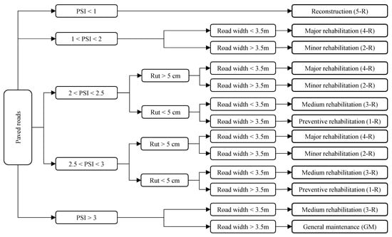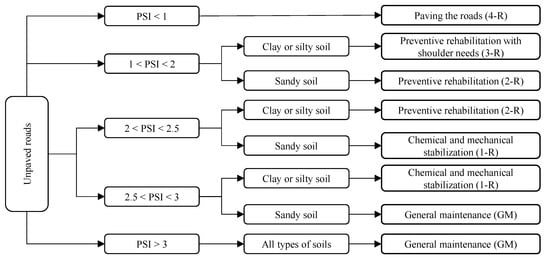 Five treatment options were proposed for the unpaved roads: general maintenance, chemical and mechanical stabilization, preventive rehabilitation, medium rehabilitation and paving procedures (GM, 1-R, 2-R, 3-R and 4-R, respectively). In addition, six treatment options were proposed for paved roads: general maintenance, preventive rehabilitation, minor rehabilitation, medium rehabilitation, major rehabilitation and reconstruction (GM, 1-R, 2-R, 3-R, 4-R and 5-R, respectively). The characteristics of these treatment options were discussed in