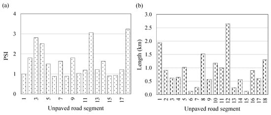 Figure 6, respectively. A detailed analysis of the traffic counts reveals significant patterns in vehicle usage. The unpaved road segments experienced traffic volumes of less than 400 vehicles per day, indicating lighter usage. In contrast, a notable portion of the paved road segments, approximately 20%, handle a heavier traffic load, with daily vehicle counts exceeding 400. The road widths of the segments varied significantly, ranging from 3 to 7 m. The collective length of the road segments was substantial, with the 18 unpaved segments and 88 paved segments together spanning a total distance of 15,236 km. This extensive network underscores the importance of understanding traffic patterns and road characteristics for the effective management of Brazilian roads.