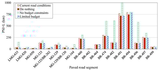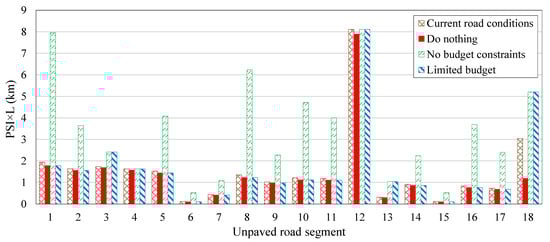 Figure 8 present similar results for four different scenarios considered in the optimization algorithm for the paved roads. In this case, the “do nothing” scenario reflects conditions after 12 months without any maintenance. The reason for this 12-month period is that the typical lifespan of paved roads without maintenance is longer than that of unpaved roads [