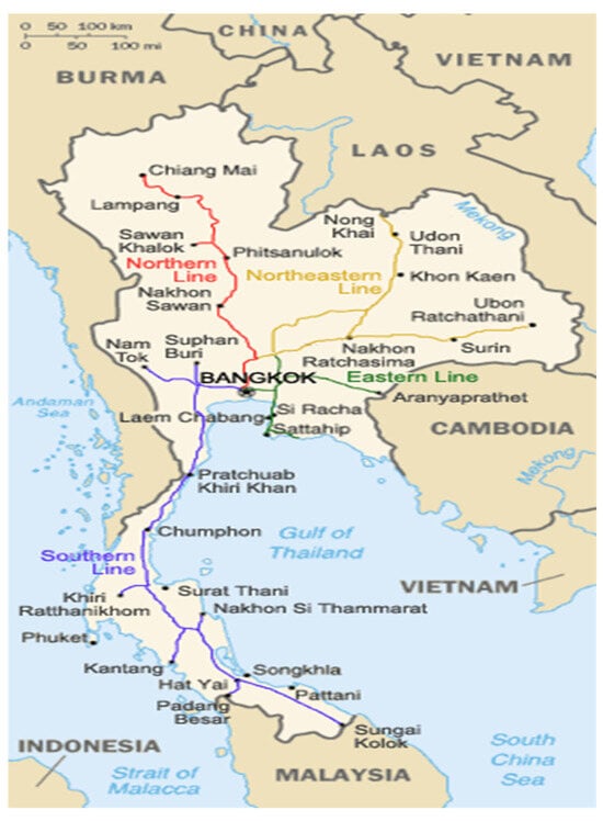 - Thai Railway Wiki. 2023. Rail Transport in Thailand. Available online: https://thai-railway.fandom.com/wiki/Rail_transport_in_Thailand (accessed on 23 May 2024).