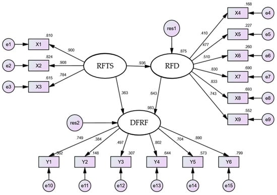 Table 6 and Figure 2 demonstrate that the test results of the three hypotheses for the RFTS were all positive, while H1 and H2 were direct and H4 was indirect. The H1 relationship between the RFTS and RFD was strong (r = 0.936). Furthermore, the correlation between the RFTS and DFRF was very high (r = 0.965) (encompassing the total effect). The RFTS was shown to have a very positive impact on RFD and DFRF, which proves H1, H2, and H4, respectively.