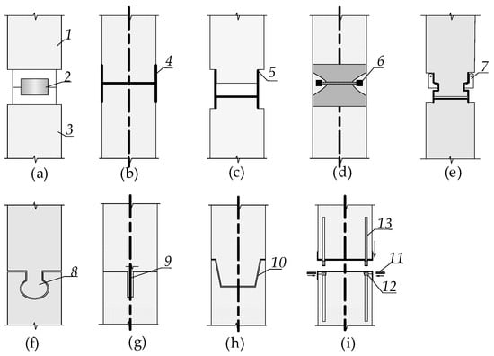 i)—connection with fixing pin; 1—top pile section; 2—steel plate welded around the perimeter; 3—bottom pile section; 4—jig; 5—corrugated reinforced concrete projection; 6—bolted connection; 7—flap lock; 8—keyway; 9—reinforcing bars of the upper section on adhesive material; 10—sealing tape; 11—pins; 12—groove; 13—fixing pin.