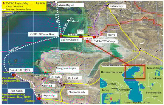 Location of Prorva seaport on the Caspian Sea coast (cargo offloading facility) [